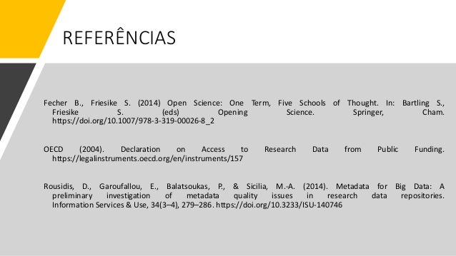 24. 24. REFERÊNCIAS Fecher B., Friesike S. (2014) Open Science: One Term, Five Schools of Thought. In: Bartling S., Friesike S. (eds) Opening Science. Springer, Cham. https://doi.org/10.1007/978-3-319-00026-8_2 OECD (2004). Declaration on Access to Research Data from Public Funding. https://legalinstruments.oecd.org/en/instruments/157 Rousidis, D., Garoufallou, E., Balatsoukas, P., & Sicilia, M.-A. (2014). Metadata for Big Data: A preliminary investigation of metadata quality issues in research data repositories. Information Services & Use, 34(3–4), 279–286. https://doi.org/10.3233/ISU-140746