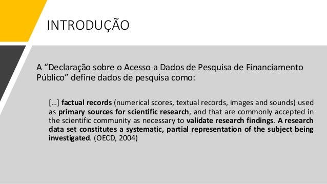 3. 3. A “Declaração sobre o Acesso a Dados de Pesquisa de Financiamento Público” define dados de pesquisa como: […] factual records (numerical scores, textual records, images and sounds) used as primary sources for scientific research, and that are commonly accepted in the scientific community as necessary to validate research findings. A research data set constitutes a systematic, partial representation of the subject being investigated. (OECD, 2004) INTRODUÇÃO