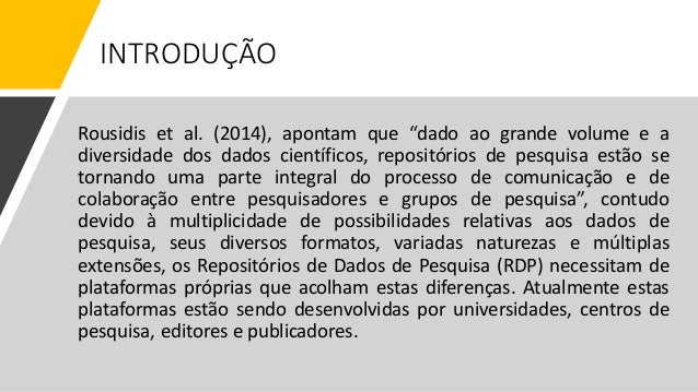 4. 4. Rousidis et al. (2014), apontam que “dado ao grande volume e a diversidade dos dados científicos, repositórios de pesquisa estão se tornando uma parte integral do processo de comunicação e de colaboração entre pesquisadores e grupos de pesquisa”, contudo devido à multiplicidade de possibilidades relativas aos dados de pesquisa, seus diversos formatos, variadas naturezas e múltiplas extensões, os Repositórios de Dados de Pesquisa (RDP) necessitam de plataformas próprias que acolham estas diferenças. Atualmente estas plataformas estão sendo desenvolvidas por universidades, centros de pesquisa, editores e publicadores. INTRODUÇÃO