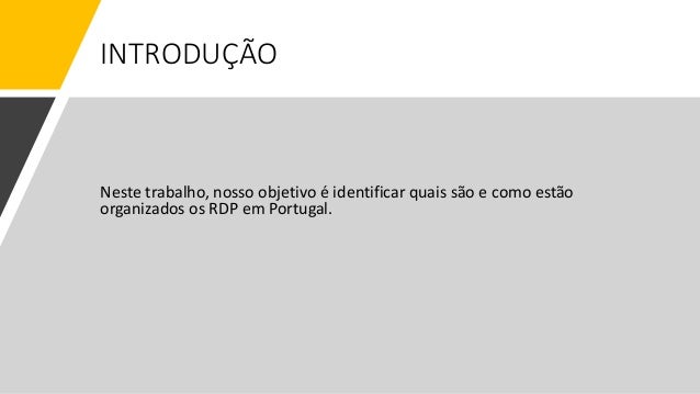 5. 5. INTRODUÇÃO Neste trabalho, nosso objetivo é identificar quais são e como estão organizados os RDP em Portugal.