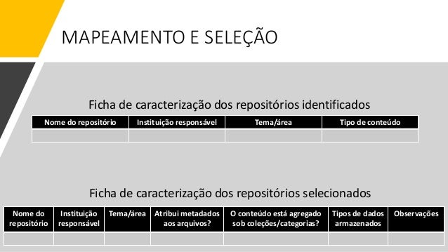 7. 7. Ficha de caracterização dos repositórios identificados MAPEAMENTO E SELEÇÃO Nome do repositório Instituição responsável Tema/área Tipo de conteúdo Ficha de caracterização dos repositórios selecionados Nome do repositório Instituição responsável Tema/área Atribui metadados aos arquivos? O conteúdo está agregado sob coleções/categorias? Tipos de dados armazenados Observações