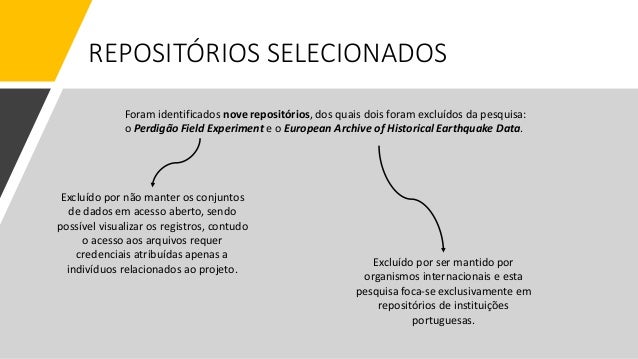 8. 8. REPOSITÓRIOS SELECIONADOS Foram identificados nove repositórios, dos quais dois foram excluídos da pesquisa: o Perdigão Field Experiment e o European Archive of Historical Earthquake Data. Excluído por ser mantido por organismos internacionais e esta pesquisa foca-se exclusivamente em repositórios de instituições portuguesas. Excluído por não manter os conjuntos de dados em acesso aberto, sendo possível visualizar os registros, contudo o acesso aos arquivos requer credenciais atribuídas apenas a indivíduos relacionados ao projeto.