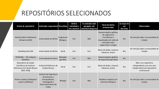9. 9. REPOSITÓRIOS SELECIONADOS Nome do repositório Instituição responsável Tema/área Atribui metadados aos arquivos O conteúdo está agregado sob coleções/categorias Tipos de dados armazenados Licenças de uso descritas Observações Antimicrobial Combination Networks (ACN) Universidade do Minho Engenharia Biológica Sim Não Representações gráficas de organismos microbianos e visualizações de redes de interação entre organismos e drogas Sim Há menção sobre a necessidade de citação DataRepositoriUM Universidade do Minho Geral Sim Sim Bases de dados, arquivos tabulares, textos Sim Há menção sobre a necessidade de citação INTEGRALL - The Integron Database Universidade de Aveiro Biologia/ genética Sim Não Representações gráficas de sequências genéticas Sim Repositório de Dados Científicos do Instituto Politécnico de Castelo Branco (RDC-IPCB) Instituto Politécnico de Castelo Branco Geral Sim Sim Bases de dados, arquivos tabulares, textos Sim Não é um repositório independente, mas sim uma coleção dentro do repositório institucional Kinetic models of biological systems (KiMoSys) Instituto de Engenharia de Sistemas e Computadores, Investigação e Desenvolvimento de Lisboa Biologia Sim Não Modelos sinápticos de sistemas biológicos Sim Há menção sobre a necessidade de citação