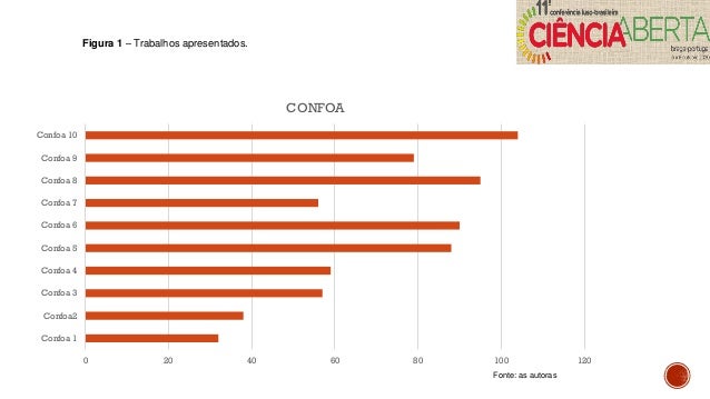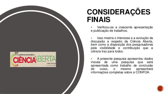 10. 10. CONSIDERAÇÕES FINAIS  Verificou-se a crescente apresentação e publicação de trabalhos.  Isso mostra o interesse e a evolução da discussão a respeito da Ciência Aberta, bem como a disposição dos pesquisadores pela visibilidade e contribuição que a ciência traz para todos.  A presente pesquisa apresentou dados iniciais de uma pesquisa que será apresentada como trabalho de conclusão de curso, o mesmo apresentará informações completas sobre a CONFOA.