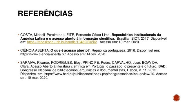 11. 11. REFERÊNCIAS  COSTA, Michelli Pereira da; LEITE, Fernando César Lima. Repositórios institucionais da América Latina e o acesso aberto à informação científica. Brasília: IBICT, 2017. Disponível em: https://repositorio.unb.br/handle/10482/23202. Acesso em: 10 mar. 2020.  CIÊNCIA ABERTA. O que é acesso aberto?. República portuguesa, 2016. Disponível em: https://www.ciencia-aberta.pt/. Acesso em: 14 fev. 2020.  SARAIVA, Ricardo; RODRIGUES, Eloy; PRINCÍPE, Pedro; CARVALHO, José; BOAVIDA, Clara. Acesso Aberto à literatura científica em Portugal: o passado, o presente e o futuro. BAD: Congresso Nacional de bibliotecários, arquivistas e documentalistas, Lisboa, n. 11, 2012. Disponível em: https://www.bad.pt/publicacoes/index.php/congressosbad/issue/view/10. Acesso em: 10 mar. 2020.