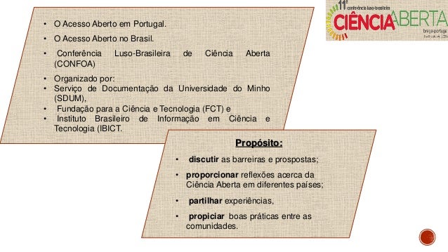 3. 3. • O Acesso Aberto em Portugal. • O Acesso Aberto no Brasil. • Conferência Luso-Brasileira de Ciência Aberta (CONFOA) • Organizado por: • Serviço de Documentação da Universidade do Minho (SDUM), • Fundação para a Ciência e Tecnologia (FCT) e • Instituto Brasileiro de Informação em Ciência e Tecnologia (IBICT. Propósito: • discutir as barreiras e prospostas; • proporcionar reflexões acerca da Ciência Aberta em diferentes países; • partilhar experiências, • propiciar boas práticas entre as comunidades.