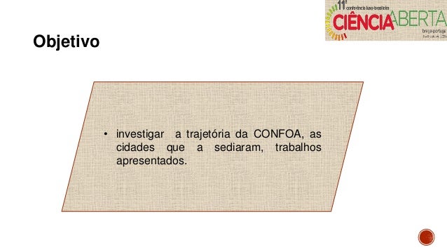 4. 4. Objetivo • investigar a trajetória da CONFOA, as cidades que a sediaram, trabalhos apresentados.