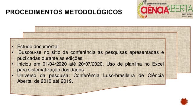 5. 5. • Estudo documental. • Buscou-se no sítio da conferência as pesquisas apresentadas e publicadas durante as edições. • Iniciou em 01/04/2020 até 20/07/2020. Uso de planilha no Excel para sistematização dos dados. • Universo da pesquisa: Conferência Luso-brasileira de Ciência Aberta, de 2010 até 2019.