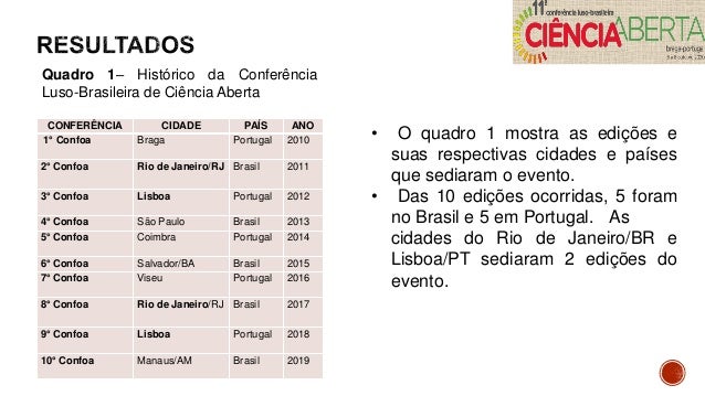 6. 6. CONFERÊNCIA CIDADE PAÍS ANO 1° Confoa Braga Portugal 2010 2° Confoa Rio de Janeiro/RJ Brasil 2011 3° Confoa Lisboa Portugal 2012 4° Confoa São Paulo Brasil 2013 5° Confoa Coimbra Portugal 2014 6° Confoa Salvador/BA Brasil 2015 7° Confoa Viseu Portugal 2016 8° Confoa Rio de Janeiro/RJ Brasil 2017 9° Confoa Lisboa Portugal 2018 10° Confoa Manaus/AM Brasil 2019 Quadro 1– Histórico da Conferência Luso-Brasileira de Ciência Aberta • O quadro 1 mostra as edições e suas respectivas cidades e países que sediaram o evento. • Das 10 edições ocorridas, 5 foram no Brasil e 5 em Portugal. As cidades do Rio de Janeiro/BR e Lisboa/PT sediaram 2 edições do evento.