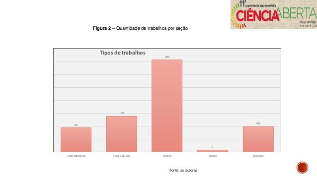 8. 8. Figura 2 – Quantidade de trabalhos por seção Fonte: as autoras 94 139 356 9 98 Comunicação Pecha Kucha Pôster Painel Sessões Tipos de trabalhos
