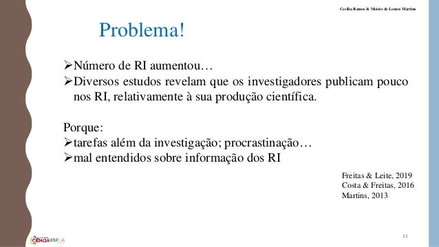 11. 11. Problema! Número de RI aumentou… Diversos estudos revelam que os investigadores publicam pouco nos RI, relativamente à sua produção científica. Porque: tarefas além da investigação; procrastinação… mal entendidos sobre informação dos RI Freitas & Leite, 2019 Costa & Freitas, 2016 Martins, 2013 11 Cecília Ramos & Moisés de Lemos Martins