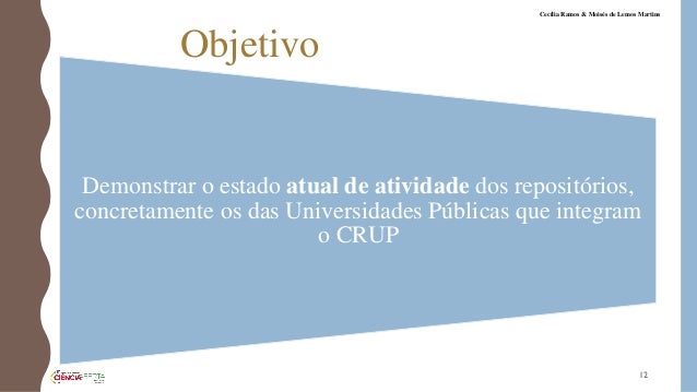 12. 12. Objetivo Demonstrar o estado atual de atividade dos repositórios, concretamente os das Universidades Públicas que integram o CRUP 12 Cecília Ramos & Moisés de Lemos Martins