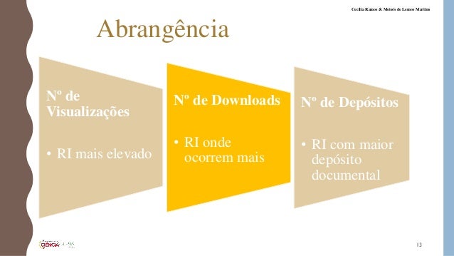 13. 13. Abrangência Nº de Visualizações • RI mais elevado Nº de Downloads • RI onde ocorrem mais Nº de Depósitos • RI com maior depósito documental 13 Cecília Ramos & Moisés de Lemos Martins