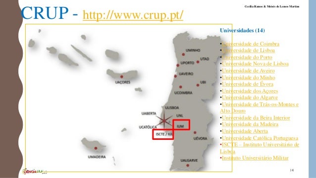 14. 14. CRUP - http://www.crup.pt/ Universidades (14) •Universidade de Coimbra •Universidade de Lisboa •Universidade do Porto •Universidade Nova de Lisboa •Universidade de Aveiro •Universidade do Minho •Universidade de Évora •Universidade dos Açores •Universidade do Algarve •Universidade de Trás-os-Montes e Alto Douro •Universidade da Beira Interior •Universidade da Madeira •Universidade Aberta •Universidade Católica Portuguesa •ISCTE – Instituto Universitário de Lisboa •Instituto Universitário Militar 14 Cecília Ramos & Moisés de Lemos Martins