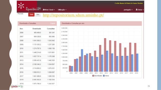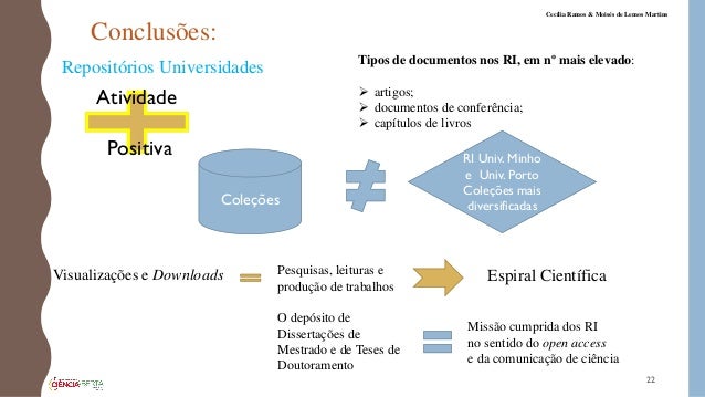 22. 22. Conclusões: 22 Cecília Ramos & Moisés de Lemos Martins Atividade Positiva Repositórios Universidades Tipos de documentos nos RI, em nº mais elevado:  artigos;  documentos de conferência;  capítulos de livros Coleções RI Univ. Minho e Univ. Porto Coleções mais diversificadas Visualizações e Downloads Pesquisas, leituras e produção de trabalhos O depósito de Dissertações de Mestrado e de Teses de Doutoramento Missão cumprida dos RI no sentido do open access e da comunicação de ciência Espiral Científica