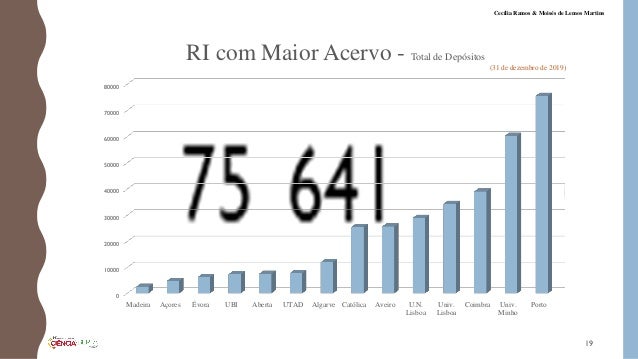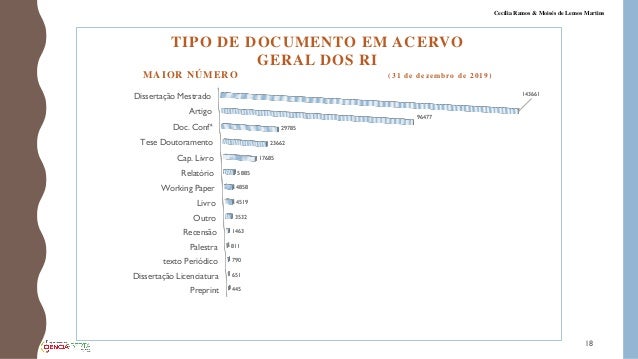 18. 18. Preprint Dissertação Licenciatura texto Periódico Palestra Recensão Outro Livro Working Paper Relatório Cap. Livro Tese Doutoramento Doc. Confª Artigo Dissertação Mestrado 445 651 790 811 1463 3532 4519 4858 5885 17685 23662 29785 96477 143661 TIPO DE DOCUMENTO EM ACERVO GERAL DOS RI MAIOR NÚMERO (31 de dezembro de 2019) 18 Cecília Ramos & Moisés de Lemos Martins