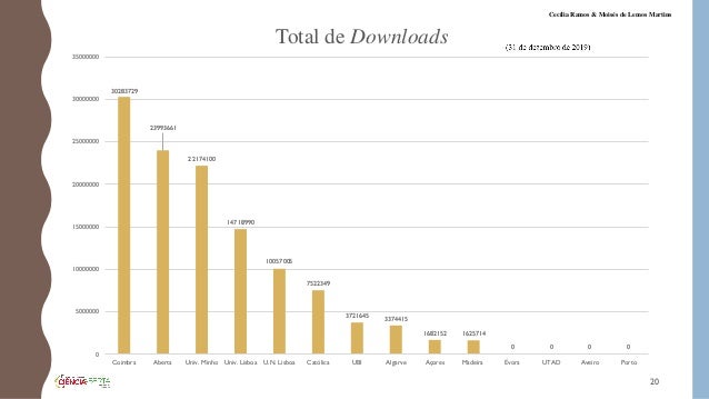 20. 20. 30283729 23993661 22174100 14718990 10057005 7522349 3721645 3374415 1682152 1625714 0 0 0 0 0 5000000 10000000 15000000 20000000 25000000 30000000 35000000 Coimbra Aberta Univ. Minho Univ. Lisboa U.N. Lisboa Católica UBI Algarve Açores Madeira Évora UTAD Aveiro Porto Total de Downloads 20 Cecília Ramos & Moisés de Lemos Martins