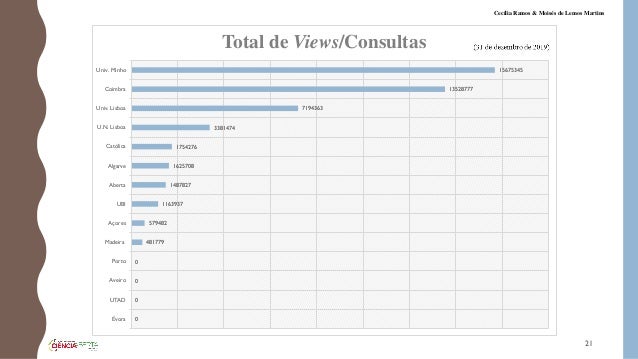 21. 21. 0 0 0 0 481779 579482 1163937 1487827 1625708 1754276 3381474 7194363 13528777 15675345 Évora UTAD Aveiro Porto Madeira Açores UBI Aberta Algarve Católica U.N. Lisboa Univ. Lisboa Coimbra Univ. Minho Total de Views/Consultas 21 Cecília Ramos & Moisés de Lemos Martins