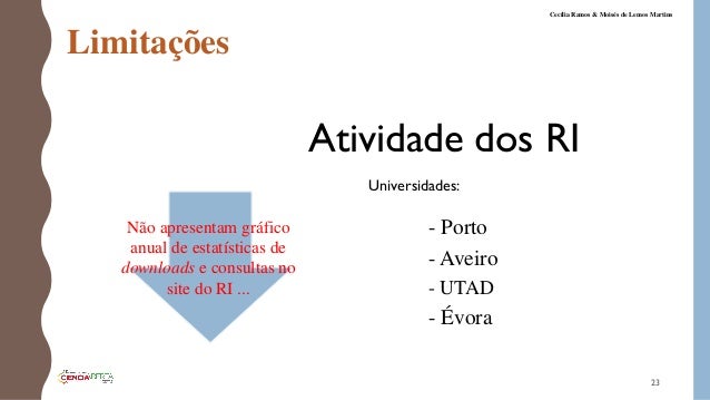 23. 23. Limitações Atividade dos RI - Porto - Aveiro - UTAD - Évora 23 Cecília Ramos & Moisés de Lemos Martins Não apresentam gráfico anual de estatísticas de downloads e consultas no site do RI ... Universidades: