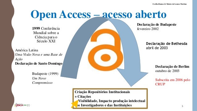 5. 5. Open Access – acesso aberto 5 Cecília Ramos & Moisés de Lemos Martins 1999 Conferência Mundial sobre a Ciência para o Século XXI América Latina Uma Visão Nova e uma Base de Ação Declaração de Santo Domingo Budapeste (1999) Um Novo Compromisso Declaração de Budapeste fevereiro 2002 Declaração de Bethesda abril de 2003 Declaração de Berlim outubro de 2003 Subscrita em 2006 pelo CRUP Criação Repositórios Institucionais + Citações Visibilidade, Impacto produção intelectual dos Investigadores e das Instituições