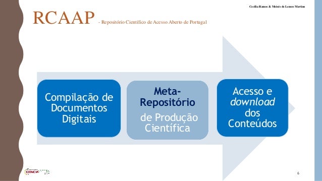6. 6. RCAAP - Repositório Científico de Acesso Aberto de Portugal Compilação de Documentos Digitais Meta- Repositório de Produção Científica Acesso e download dos Conteúdos 6 Cecília Ramos & Moisés de Lemos Martins