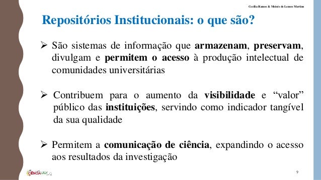 9. 9. Repositórios Institucionais: o que são?  São sistemas de informação que armazenam, preservam, divulgam e permitem o acesso à produção intelectual de comunidades universitárias  Contribuem para o aumento da visibilidade e “valor” público das instituições, servindo como indicador tangível da sua qualidade  Permitem a comunicação de ciência, expandindo o acesso aos resultados da investigação 9 Cecília Ramos & Moisés de Lemos Martins