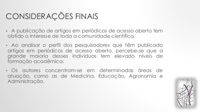 10. 10. CONSIDERAÇÕES FINAIS • A publicação de artigos em periódicos de acesso aberto tem obtido o interesse de toda a comunidade científica. • Ao analisar o perfil dos pesquisadores que têm publicado artigos em periódicos de acesso aberto, percebe-se que a grande maioria desses indivíduos tem elevado níveis de formação acadêmica. • Os autores concentram-se em determinadas áreas de atuação, como as de Medicina, Educação, Agronomia e Administração.