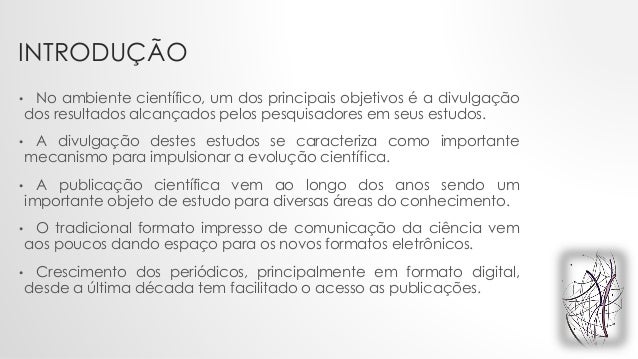 2. 2. INTRODUÇÃO • No ambiente científico, um dos principais objetivos é a divulgação dos resultados alcançados pelos pesquisadores em seus estudos. • A divulgação destes estudos se caracteriza como importante mecanismo para impulsionar a evolução científica. • A publicação científica vem ao longo dos anos sendo um importante objeto de estudo para diversas áreas do conhecimento. • O tradicional formato impresso de comunicação da ciência vem aos poucos dando espaço para os novos formatos eletrônicos. • Crescimento dos periódicos, principalmente em formato digital, desde a última década tem facilitado o acesso as publicações.