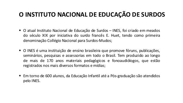 2. 2.  O atual Instituto Nacional de Educação de Surdos – INES, foi criado em meados do século XIX por iniciativa do surdo francês E. Huet, tendo como primeira denominação Collégio Nacional para Surdos-Mudos;  O INES é uma instituição de ensino brasileira que promove fóruns, publicações, seminários, pesquisas e assessorias em todo o Brasil. Tem produzido ao longo de mais de 170 anos materiais pedagógicos e fonoaudiólogos, que estão registrados nos mais diversos formatos e mídias;  Em torno de 600 alunos, da Educação Infantil até a Pós-graduação são atendidos pelo INES. O INSTITUTO NACIONAL DE EDUCAÇÃO DE SURDOS