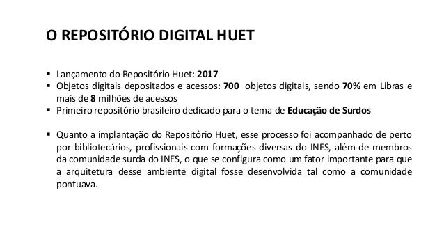 3. 3. O REPOSITÓRIO DIGITAL HUET  Lançamento do Repositório Huet: 2017  Objetos digitais depositados e acessos: 700 objetos digitais, sendo 70% em Libras e mais de 8 milhões de acessos  Primeiro repositório brasileiro dedicado para o tema de Educação de Surdos  Quanto a implantação do Repositório Huet, esse processo foi acompanhado de perto por bibliotecários, profissionais com formações diversas do INES, além de membros da comunidade surda do INES, o que se configura como um fator importante para que a arquitetura desse ambiente digital fosse desenvolvida tal como a comunidade pontuava.
