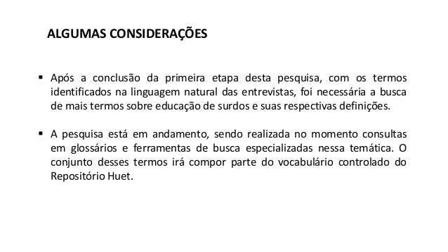 7. 7. ALGUMAS CONSIDERAÇÕES  Após a conclusão da primeira etapa desta pesquisa, com os termos identificados na linguagem natural das entrevistas, foi necessária a busca de mais termos sobre educação de surdos e suas respectivas definições.  A pesquisa está em andamento, sendo realizada no momento consultas em glossários e ferramentas de busca especializadas nessa temática. O conjunto desses termos irá compor parte do vocabulário controlado do Repositório Huet.