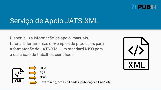 11. 11. Serviço de Apoio JATS-XML Disponibiliza informação de apoio, manuais, tutoriais, ferramentas e exemplos de processos para a formatação do JATS-XML, um standard NISO para a descrição de trabalhos científicos. HTML PDF ePub Text mining, acessibilidades, publicações FAIR etc...