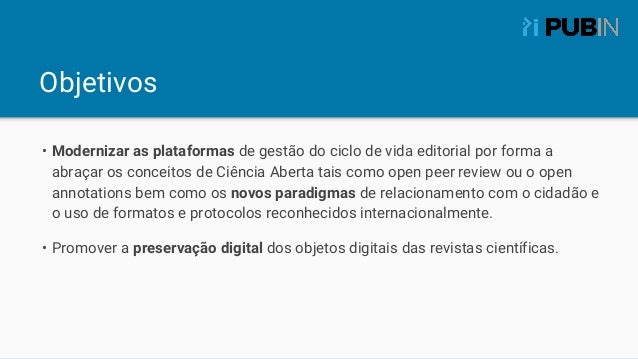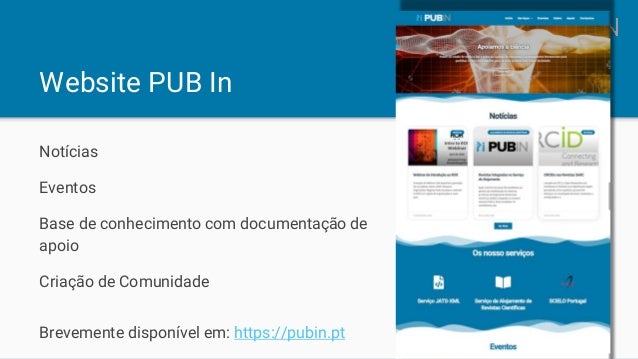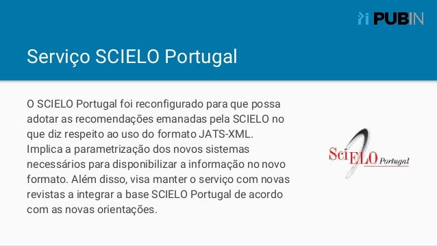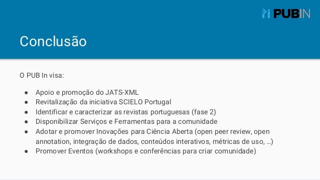31. 31. Conclusão O PUB In visa: ● Apoio e promoção do JATS-XML ● Revitalização da iniciativa SCIELO Portugal ● Identificar e caracterizar as revistas portuguesas (fase 2) ● Disponibilizar Serviços e Ferramentas para a comunidade ● Adotar e promover Inovações para Ciência Aberta (open peer review, open annotation, integração de dados, conteúdos interativos, métricas de uso, …) ● Promover Eventos (workshops e conferências para criar comunidade)