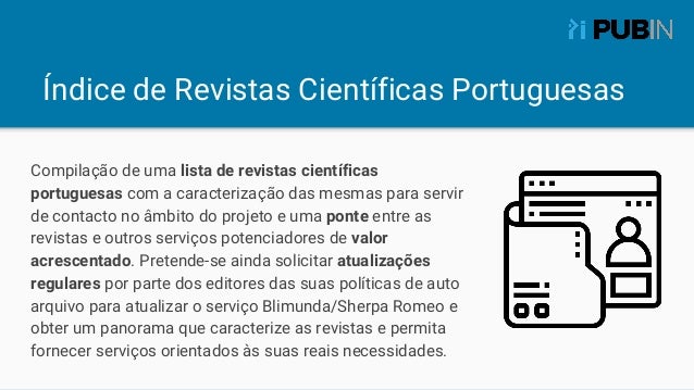 13. 13. Índice de Revistas Científicas Portuguesas Compilação de uma lista de revistas científicas portuguesas com a caracterização das mesmas para servir de contacto no âmbito do projeto e uma ponte entre as revistas e outros serviços potenciadores de valor acrescentado. Pretende-se ainda solicitar atualizações regulares por parte dos editores das suas políticas de auto arquivo para atualizar o serviço Blimunda/Sherpa Romeo e obter um panorama que caracterize as revistas e permita fornecer serviços orientados às suas reais necessidades.