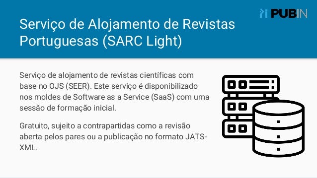 14. 14. Serviço de Alojamento de Revistas Portuguesas (SARC Light) Serviço de alojamento de revistas científicas com base no OJS (SEER). Este serviço é disponibilizado nos moldes de Software as a Service (SaaS) com uma sessão de formação inicial. Gratuito, sujeito a contrapartidas como a revisão aberta pelos pares ou a publicação no formato JATS- XML.