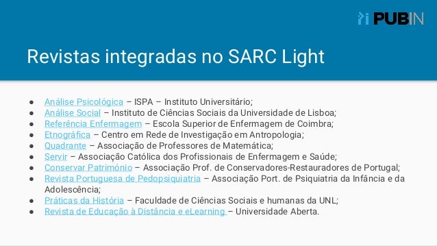 15. 15. Revistas integradas no SARC Light ● Análise Psicológica – ISPA – Instituto Universitário; ● Análise Social – Instituto de Ciências Sociais da Universidade de Lisboa; ● Referência Enfermagem – Escola Superior de Enfermagem de Coimbra; ● Etnográfica – Centro em Rede de Investigação em Antropologia; ● Quadrante – Associação de Professores de Matemática; ● Servir – Associação Católica dos Profissionais de Enfermagem e Saúde; ● Conservar Património – Associação Prof. de Conservadores-Restauradores de Portugal; ● Revista Portuguesa de Pedopsiquiatria – Associação Port. de Psiquiatria da Infância e da Adolescência; ● Práticas da História – Faculdade de Ciências Sociais e humanas da UNL; ● Revista de Educação à Distância e eLearning – Universidade Aberta.