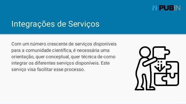 18. 18. Integrações de Serviços Com um número crescente de serviços disponíveis para a comunidade científica, é necessária uma orientação, quer conceptual, quer técnica de como integrar os diferentes serviços disponíveis. Este serviço visa facilitar esse processo.
