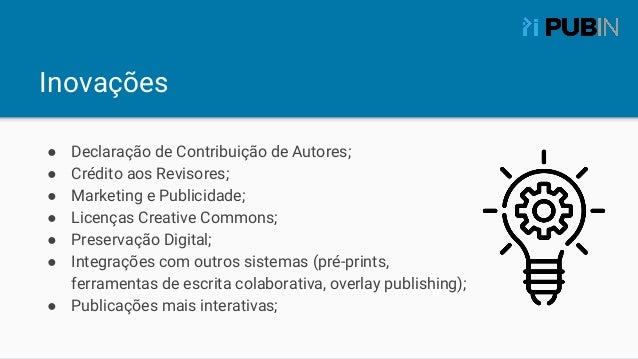 20. 20. Inovações ● Declaração de Contribuição de Autores; ● Crédito aos Revisores; ● Marketing e Publicidade; ● Licenças Creative Commons; ● Preservação Digital; ● Integrações com outros sistemas (pré-prints, ferramentas de escrita colaborativa, overlay publishing); ● Publicações mais interativas;