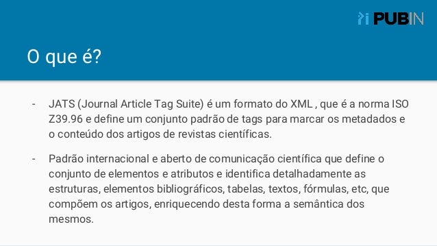 22. 22. O que é? - JATS (Journal Article Tag Suite) é um formato do XML , que é a norma ISO Z39.96 e define um conjunto padrão de tags para marcar os metadados e o conteúdo dos artigos de revistas científicas. - Padrão internacional e aberto de comunicação científica que define o conjunto de elementos e atributos e identifica detalhadamente as estruturas, elementos bibliográficos, tabelas, textos, fórmulas, etc, que compõem os artigos, enriquecendo desta forma a semântica dos mesmos.
