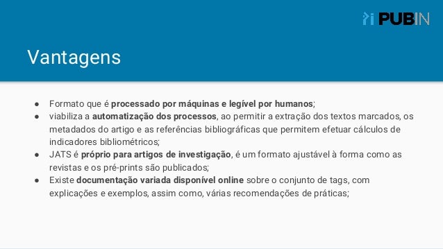 23. 23. Vantagens ● Formato que é processado por máquinas e legível por humanos; ● viabiliza a automatização dos processos, ao permitir a extração dos textos marcados, os metadados do artigo e as referências bibliográficas que permitem efetuar cálculos de indicadores bibliométricos; ● JATS é próprio para artigos de investigação, é um formato ajustável à forma como as revistas e os pré-prints são publicados; ● Existe documentação variada disponível online sobre o conjunto de tags, com explicações e exemplos, assim como, várias recomendações de práticas;