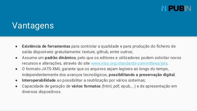 24. 24. Vantagens ● Existência de ferramentas para controlar a qualidade e para produção do ficheiro de saída disponíveis gratuitamente: texture, github, entre outros; ● Assume um padrão dinâmico, pelo que os editores e utilizadores podem solicitar novos recursos e alterações, através do site www.niso.org/standards-committees/jats. ● O formato JATS-XML garante que os arquivos sejam legíveis ao longo do tempo, independentemente dos avanços tecnológicos, possibilitando a preservação digital; ● Interoperabilidade ao possibilitar a reutilização por vários sistemas; ● Capacidade de geração de vários formatos (html, pdf, epub,...) e de apresentação em diversos dispositivos.