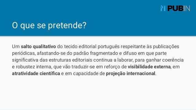 32. 32. O que se pretende? Um salto qualitativo do tecido editorial português respeitante às publicações periódicas, afastando-se do padrão fragmentado e difuso em que parte significativa das estruturas editoriais continua a laborar, para ganhar coerência e robustez interna, que vão traduzir-se em reforço de visibilidade externa, em atratividade científica e em capacidade de projeção internacional.