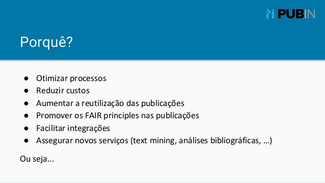 33. 33. Porquê? ● Otimizar processos ● Reduzir custos ● Aumentar a reutilização das publicações ● Promover os FAIR principles nas publicações ● Facilitar integrações ● Assegurar novos serviços (text mining, análises bibliográficas, …) Ou seja...