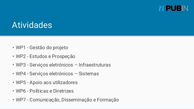 8. 8. Atividades • WP1 - Gestão do projeto • WP2 - Estudos e Prospeção • WP3 - Serviços eletrónicos – Infraestruturas • WP4 - Serviços eletrónicos – Sistemas • WP5 - Apoio aos utilizadores • WP6 - Políticas e Diretrizes • WP7 - Comunicação, Disseminação e Formação