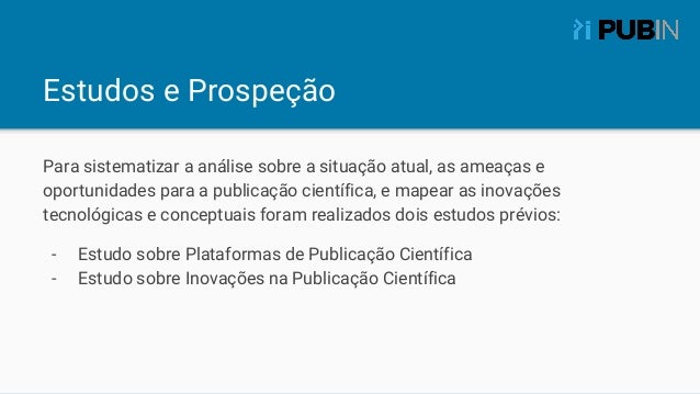 9. 9. Estudos e Prospeção Para sistematizar a análise sobre a situação atual, as ameaças e oportunidades para a publicação científica, e mapear as inovações tecnológicas e conceptuais foram realizados dois estudos prévios: - Estudo sobre Plataformas de Publicação Científica - Estudo sobre Inovações na Publicação Científica