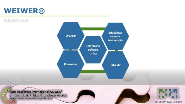 11. 11. Rede Académica Internacional WEIWER® um exemplo de Práticas Educacionais Abertas Teresa Cardoso, Filomena Pestana, João Pinto WEIWER® Objetivos Disseminar Divulgar Estimulara reflexão critica Estabelecer redes de intervenção Difundir 11.ª ConfOA 2020, 6 outubro