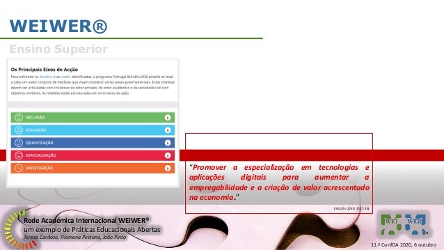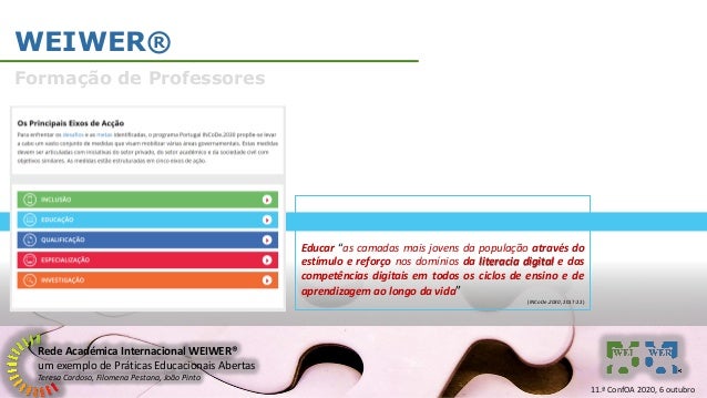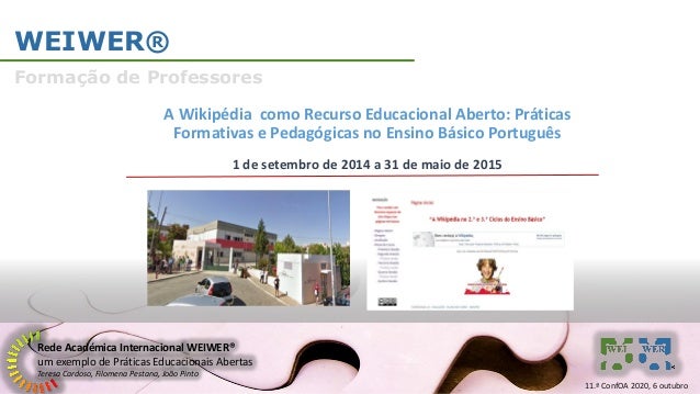 13. 13. Rede Académica Internacional WEIWER® um exemplo de Práticas Educacionais Abertas Teresa Cardoso, Filomena Pestana, João Pinto WEIWER® Formação de Professores A Wikipédia como Recurso Educacional Aberto: Práticas Formativas e Pedagógicas no Ensino Básico Português 1 de setembro de 2014 a 31 de maio de 2015 11.ª ConfOA 2020, 6 outubro