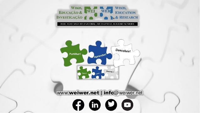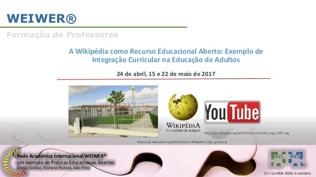 15. 15. Rede Académica Internacional WEIWER® um exemplo de Práticas Educacionais Abertas Teresa Cardoso, Filomena Pestana, João Pinto WEIWER® Formação de Professores A Wikipédia como Recurso Educacional Aberto: Exemplo de Integração Curricular na Educação de Adultos 24 de abril, 15 e 22 de maio de 2017 11.ª ConfOA 2020, 6 outubro https://pt.wikipedia.org/wiki/Ficheiro:Wikipedia_logo_gold.png https://pt.wikipedia.org/wiki/Ficheiro:YouTube_Logo_2017.svg