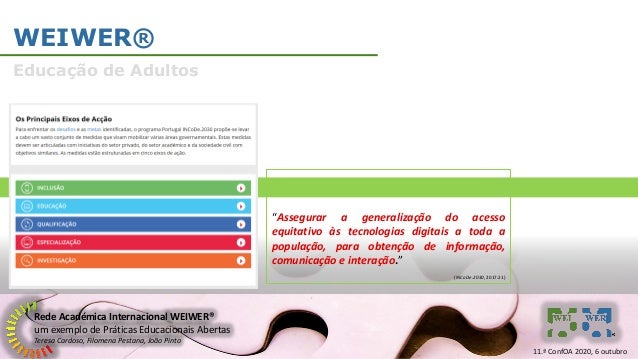 16. 16. Rede Académica Internacional WEIWER® um exemplo de Práticas Educacionais Abertas Teresa Cardoso, Filomena Pestana, João Pinto WEIWER® Educação de Adultos “Assegurar a generalização do acesso equitativo às tecnologias digitais a toda a população, para obtenção de informação, comunicação e interação.” (INCoDe.2030, 2017:21) 11.ª ConfOA 2020, 6 outubro