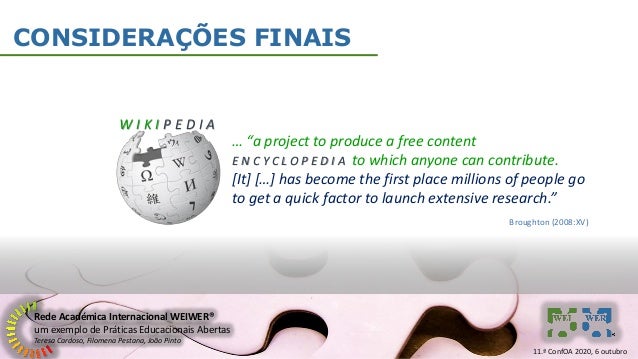 19. 19. Rede Académica Internacional WEIWER® um exemplo de Práticas Educacionais Abertas Teresa Cardoso, Filomena Pestana, João Pinto CONSIDERAÇÕES FINAIS W I K I P E D I A … “a project to produce a free content E N C Y C L O P E D I A to which anyone can contribute. [It] […] has become the first place millions of people go to get a quick factor to launch extensive research.” Broughton (2008:XV) 11.ª ConfOA 2020, 6 outubro